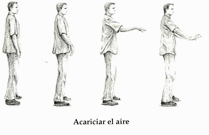 Acariciar el aire1Con este ejercicio entrenamos un tipo de respiración que tiene como virtud la regularización de la energía, es decir, si la persona está algo excitada, nerviosa o inquieta, le ayuda a calmarse. También nos permite centrarnos y aumentar la atención. Esta práctica pertenece al llamado Entrenamiento Respiratorio de tipo Dinámico. Dicho entrenamiento se realiza de pie, al tiempo que realizamos algún movimiento mientras sincronizamos nuestra respiración con él. Esta forma de entrenamiento se conoce como Respiración Sincronizada (aunque en este caso  se hace con los movimientos, se podría realizar también con los pensamientos). En este ejercicio, cada movimiento va a corresponder a un tiempo respiratorio, de tal manera que la velocidad con la que se ejecuta cada gesto está relacionada con la velocidad a la que se inspira y espira. Se comienza el ejercicio de pie, en la vertical y adoptando la Posición Básica de Entrenamiento de Pie. Realizamos los ajustes oportunos, habitamos el cuerpo, centramos la atención. Abrimos los pies a la anchura de los hombros, separando el pie izquierdo del derecho que permanece en su sitio. Los brazos están a lo largo del cuerpo y hemos realizado previamente todos los ajustes corporales en esta posición. Al inspirar los brazos ascienden por delante hasta la altura natural de los hombros…. al espirar los brazos bajan hasta la región Hara (Dan Tien), dos tres dedos debajo del ombligo…. volvemos a inspirar…. subiendo los brazos… volvemos a espirar bajando los brazos…. Realizamos estos movimientos lentamente… lo más lentamente que podamos, en función de nuestra capacidad respiratoria… después de unos minutos de práctica (5, 10, 15…)… tras una espiración, cerramos las piernas juntando los pies, el izquierdo se aproxima al derecho, y llevamos las manos, cruzadas  una sobre otra, a la altura del Hara (Dan Tien). Las mujeres situarán la mano derecha en contacto con el abdomen y la izquierda encima. Los varones situarán la izquierda sobre el abdomen y la derecha encima. En esta posición, cerramos los ojos unos instantes, centramos nuestra respiración y nuestra energía justo en la zona donde apoyan las manos, y después de uno o dos minutos, abrimos los párpados y salimos de la postura.” La práctica constante de este ejercicio nos permite conseguir múltiples beneficios a nivel físico, psicológico y energético. Se dice que mejora la energía de los pulmones y la tráquea, fortaleciendo estos órganos y previniendo sus enfermedades, ayuda a relajar el cuerpo y la mente; y nos induce un estado de calma y tranquilidad en el que podemos disfrutar mejor de nuestro momento presente.